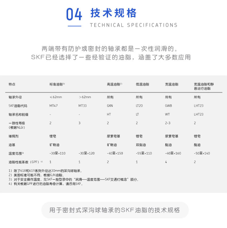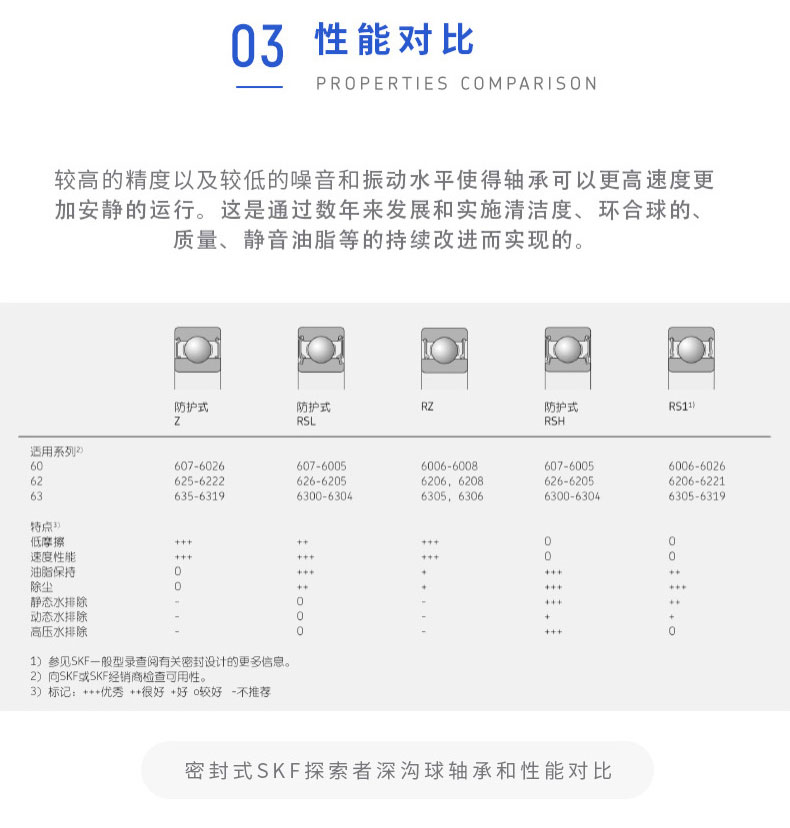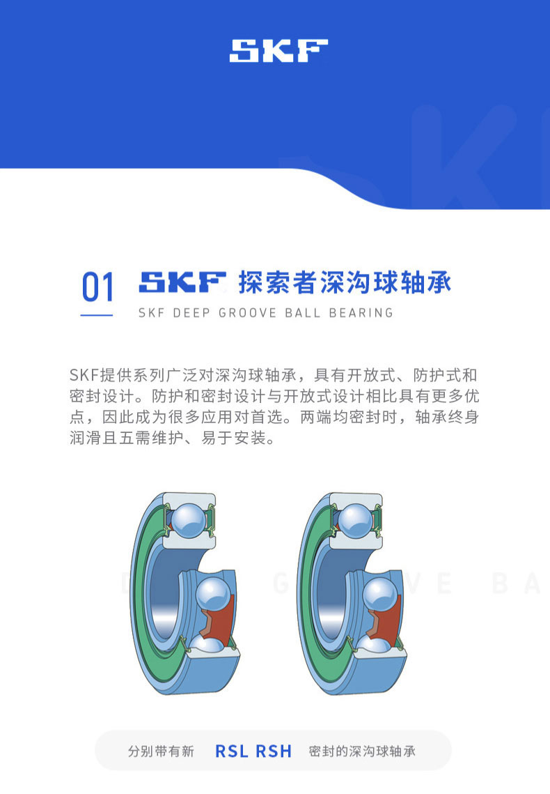 SKF深沟球轴承是一种仪器器件,有开式、双面带密封圈,带密封的轴承在外圈上开有可装密封圈或防尘盖的沟槽,适用于高转速甚至极高转速的运行。